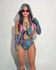 Fit so bright you can light the night! Our iconic happy hour print just got an upgrade in this rainbow reflective bodysuit style. Featuring detachable smiley face chains, your next IG post is going to slayyyy in this fit.