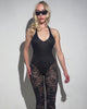 the Heartbreak Hottie Lace Jumpsuit is bold and flirty with sheer lace down the legs and curve hugging corset detailing on your back and thighs. made to show off your confidence while keeping every move comfortable and dramatic.