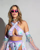 Beam down from the mainstage looking like a Y2K space princess with the Rolita Couture x iHR Cosmic Chrome Goddess Top! Featuring a criss-cross design, keyhole cutout, and a head-turning UV-reactive chrome print.