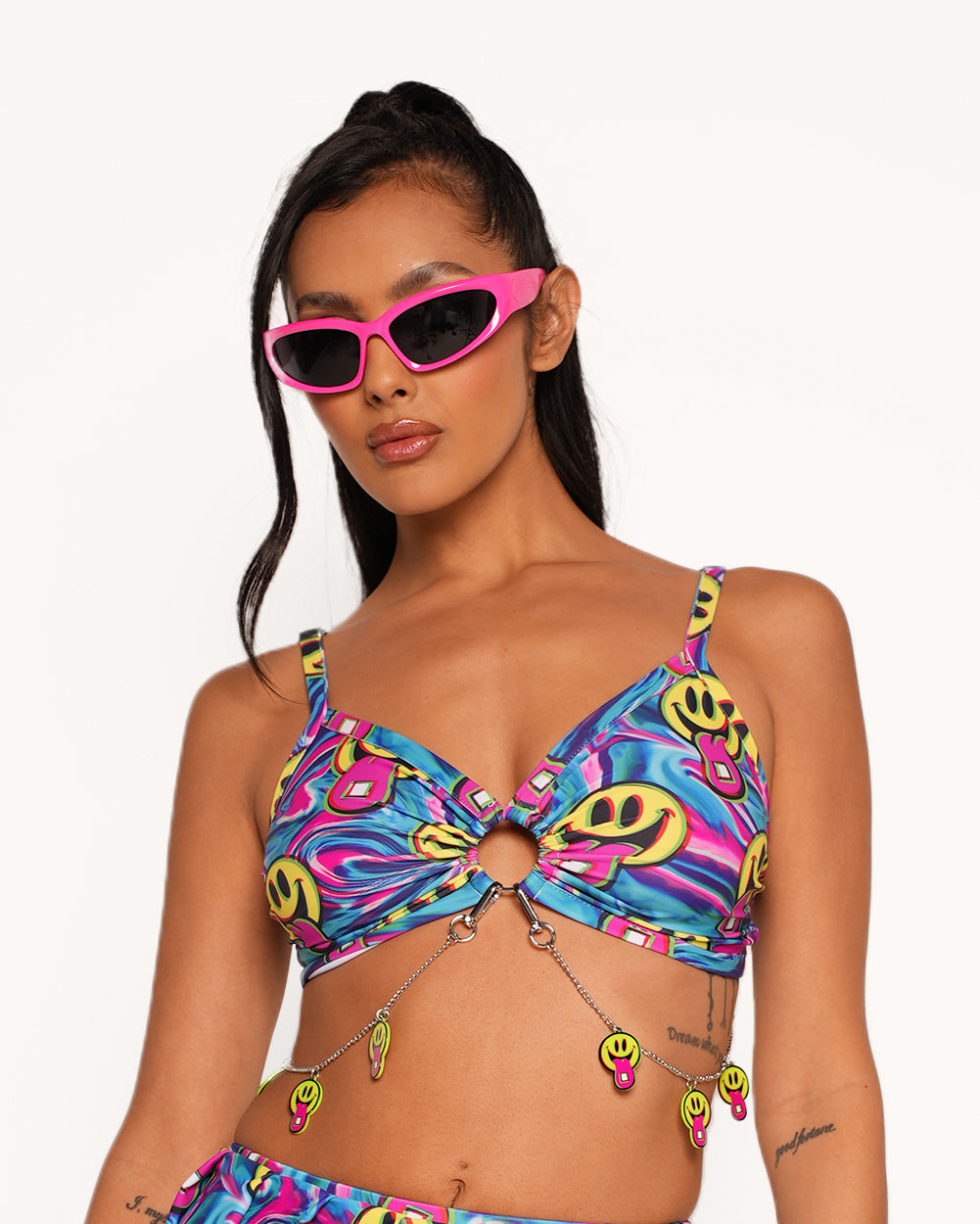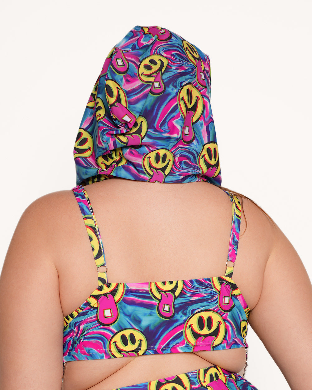 Put on the Happy Hour Hood and instantly feel the night come alive! With our iconic acid smileys all over this bra top, you're sure to steal the scene and immerse yourself in pure bliss.