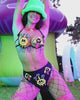 It's colorful vibes and good times with the Tripp Out Carnival Bra! With our iconic acid smileys supersized into a bra top and neon rhinestone chains, this top is definitely a head-turner.