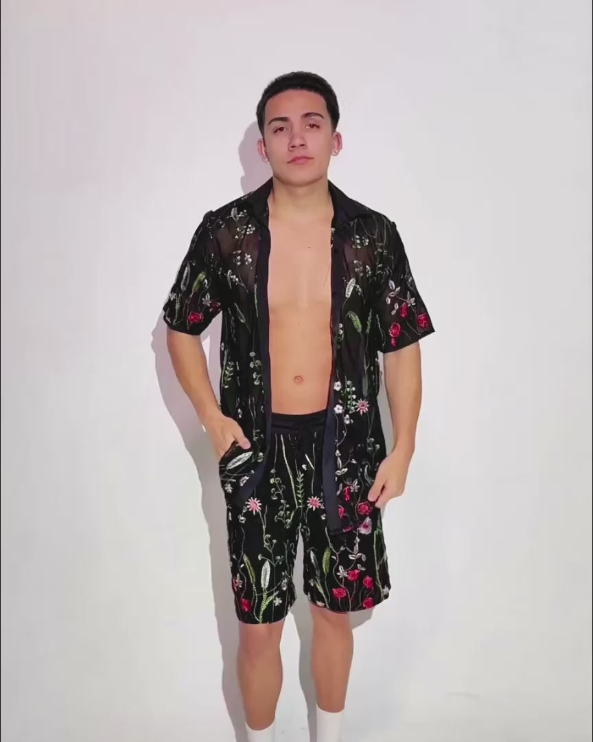 Bring the midnight vibes to life with the Lace Flowerfields Stretch Men's Shorts! These edgy shorts are adorned with embroidered wildflowers, giving off enchanting forest floor energy.