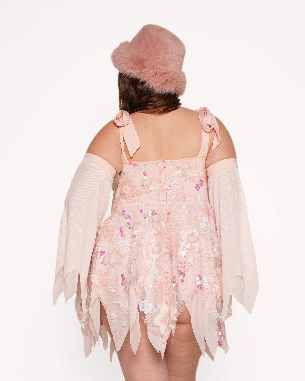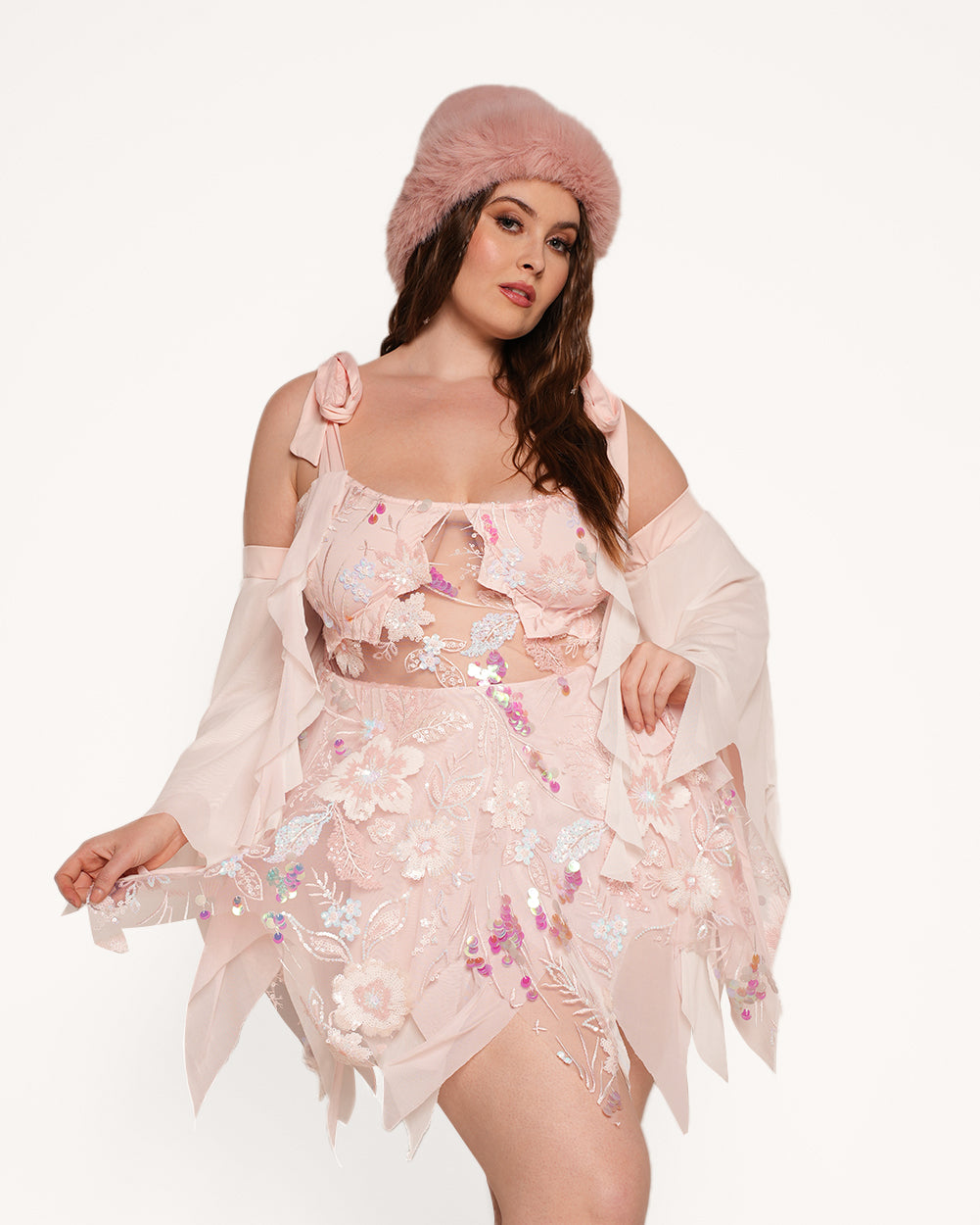 Get lost in the magic with the Far, Far Away Sparkle Dress Set! This dreamy masterpiece is simply made perfect for festival magic. With glistening floral embroidery, cascading ruffles, and ethereal sheer details, this fit will have you floating through the crowd like a mystical enchantress.