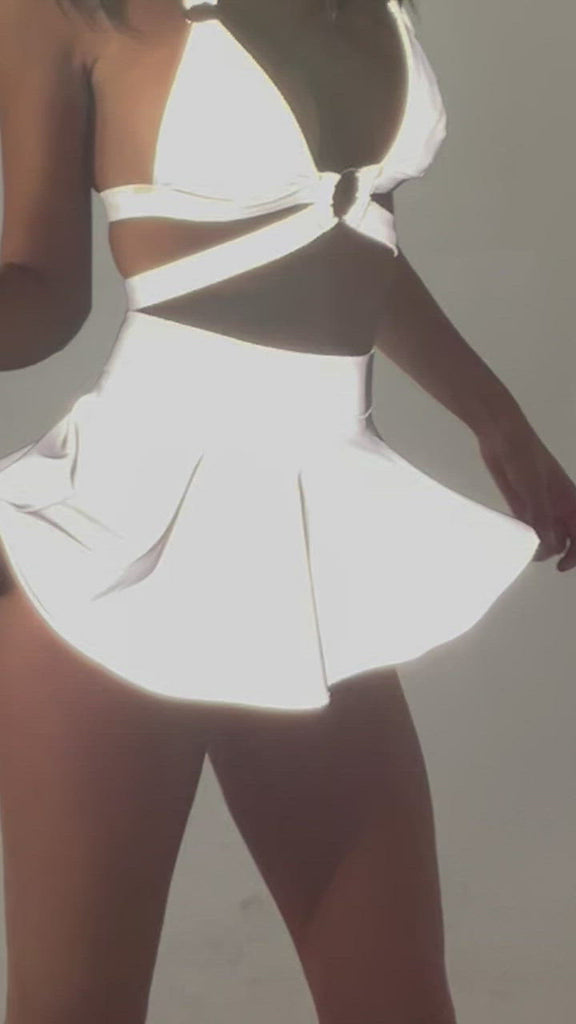 Light up the night with the Charge of Light Reflective Skater Skirt. This flowy skirt has a high-waisted cut, pleated design, and a pinkish reflective glow. Finish off the look with some reflective pasties and body glitter and you're ready to slay.