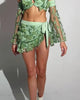 Wander into the unknown with the Curious Traveler Skirt! Featuring a side-slit design and a sage green construction with a delicate mesh overlay decorated with 3D floral details.