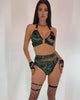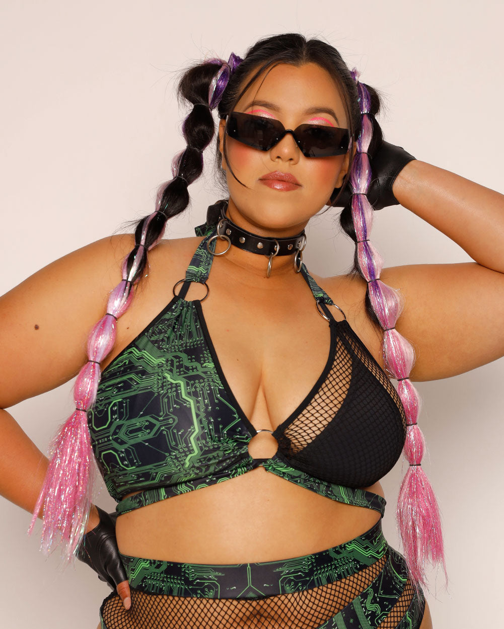 Morph into supremacy with the Cyber Matrix O-Ring Bra Top! This women's rave top feature a halter neckline, fishnet splice design, and an eye-catching geometric print.